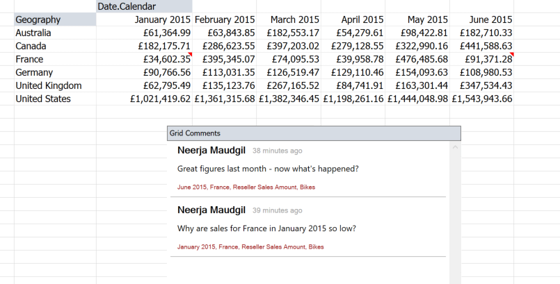 Comments for a particular datapoint eg Germany, Bikes, January 2015 can potentially be viewed in all reports that refer to that datapoint (as long as the destination grid is enabled to display comments).