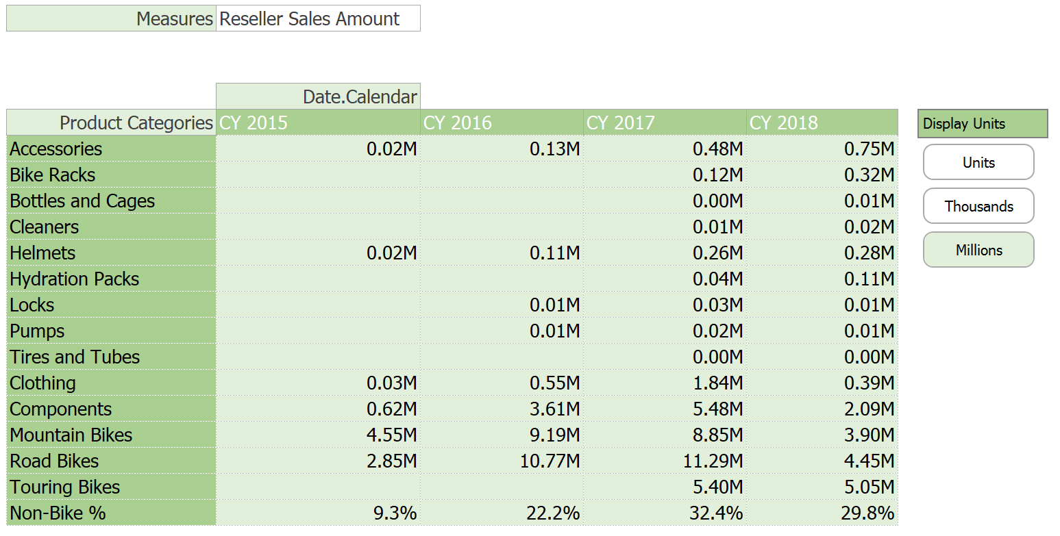 With the format sheet as shown above, based on the user’s slicer selection, all members will then be displayed with the predefined Millions format as ‘*’ is a wildcard and will match on all the members in the Product Categories hierarchy.