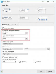 ‘Enabling Update Range with selection’ means that the slicer choice is written to a cell in the workbook – in our example it’s cell $M$17 (shown in red in screenshot below) – currently Millions are selected.