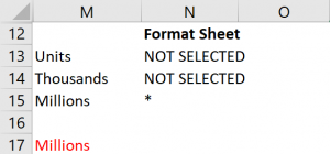We now need to reflect that in the format sheet. This is done by first adding three rows for the relevant hierarchy, and setting the Excel numeric format column G to units on the first row, and then thousands and millions on the other two.