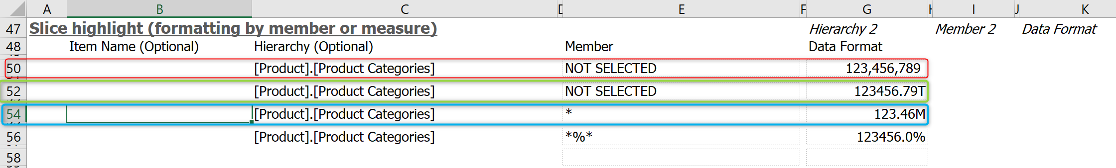 We can then set the ‘Member’ cells in column E as a simple formula referencing the table shown above. For example, the Unit’s member incell E50 in the XLCubedFormats sheet is set as =Sheet1!N13. The same process is followed for Thousands and Millions.