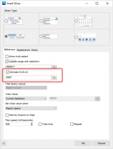 You can insert an XL3Link from the XLCubed ribbon > Insert formula > XL3Link. In this scenario, you could leave the “Link to” field blank (we don’t need to jump to a new location in the workbook). The important part is setting the target cell with the value TRUE. You will then need to create an XL3RefreshObjects formula in another cell. This formula needs a ‘trigger’, i.e. something to tell it when to refresh. In this example it is the cell $I$6. So, when the XL3Link it clicked (or activated via the slicer), this sets I6 to true, which tells the XL3RefreshObjects to run. It does this, then sets I6 back to false.