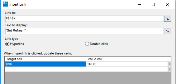 I7 is set as =XL3Link(XL3Address($K$7),”Set Refresh”,,XL3Address($I$6),TRUE)