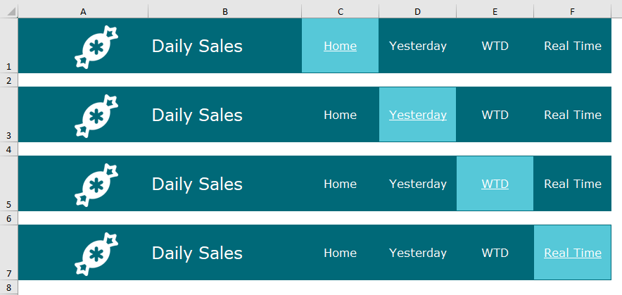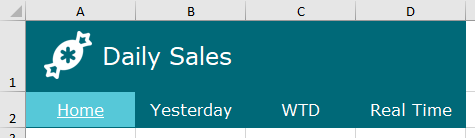 The dashboard uses a paged viewport that displays an Excel range with the navigation design. Each page has a different viewport pointing to a different range so that the current page appears to be highlighted.