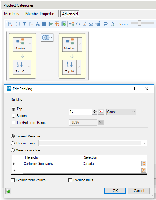 If we have the top 10 products for Canada, we can combine those with the top 10 in France. Here’s the initial setup. (The settings for the second ranking are the same, just with the selected country swapped)