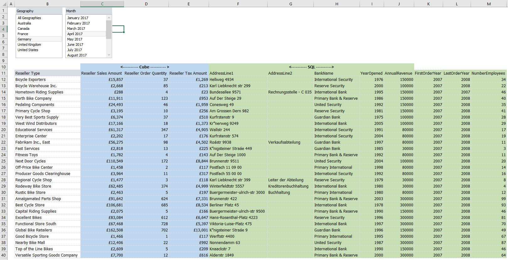 Take the example below based on Reseller sales, where the cells in blue are from Analysis Services, and those in green are from SQL Server. The SQL data relates to Reseller Banking details in this case but could be credit history or any other required information. The report is filtered by a slicer allowing users to show only Resellers in the selected country.