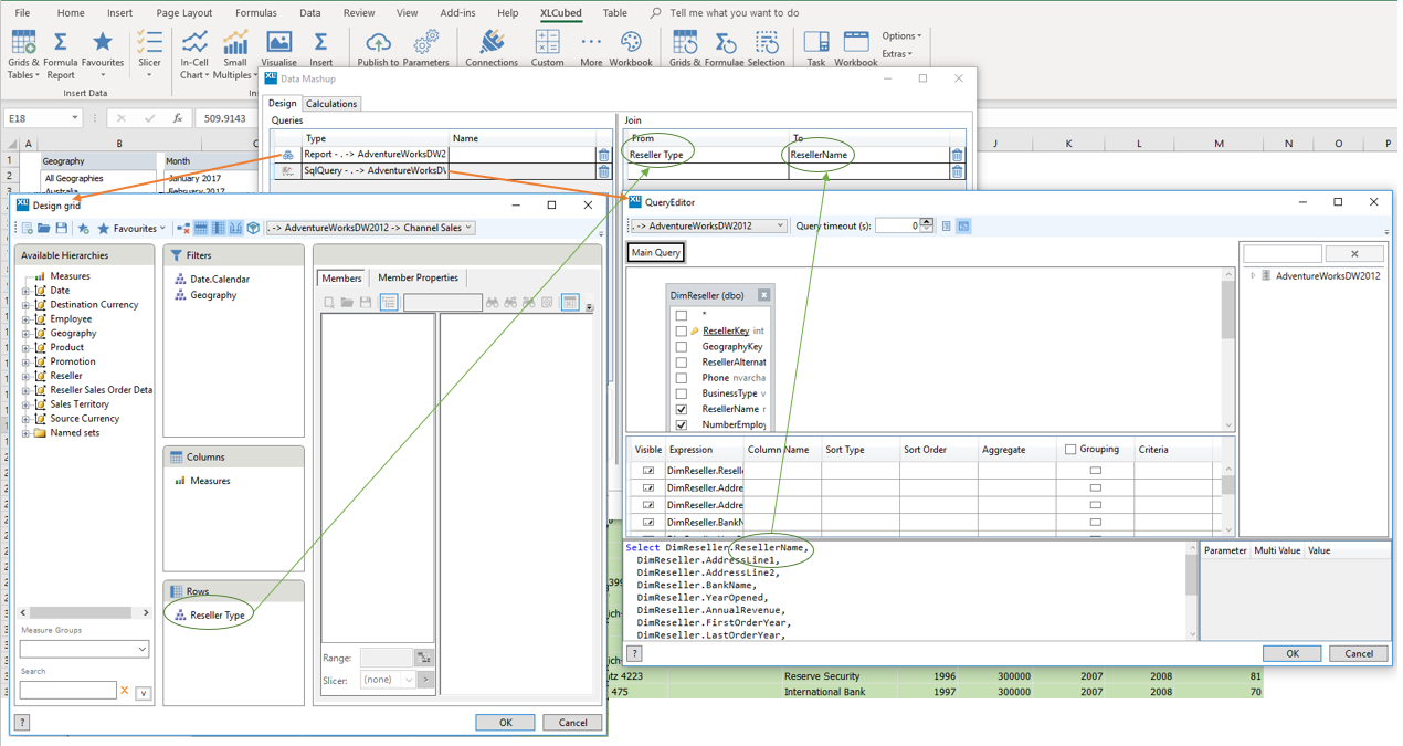 As this is a simple list report, we’ll use an XLCubed Table. When you add the Table and choose the Data Mashup Connection, you’ll be asked to define the 2 queries, and then how they join together. To create the join you’ll need to be able to match on one or more fields, in this case the Reseller Name (yes, a key would be better…).