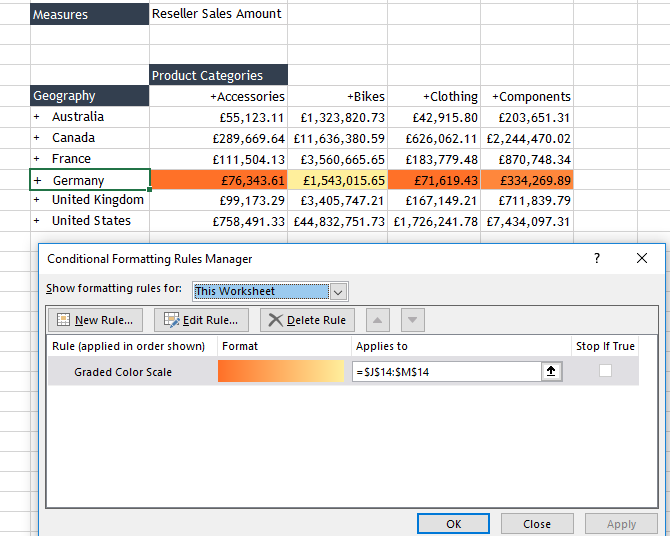You can also use Excel’s standard conditional formatting options to format a member or level within the grid.