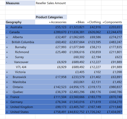 After formatting at the country level, I have also selected and formatted each lower level – ie state, province, city, postal code. This means that when you drill down into the grid you can see the different levels clearly.
