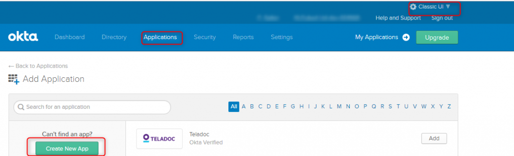 The first step is to setup a new application in Okta, make sure you are in “Classic UI” mode and click the Applications tab and then “Create New App”.