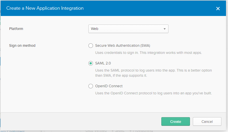 Set the platform to “Web” and the sign on method to “SAML 2.0”