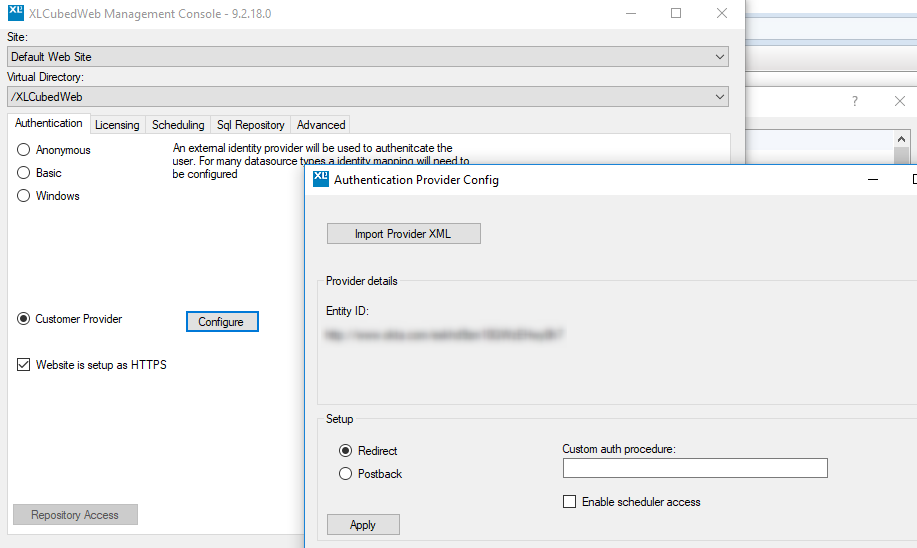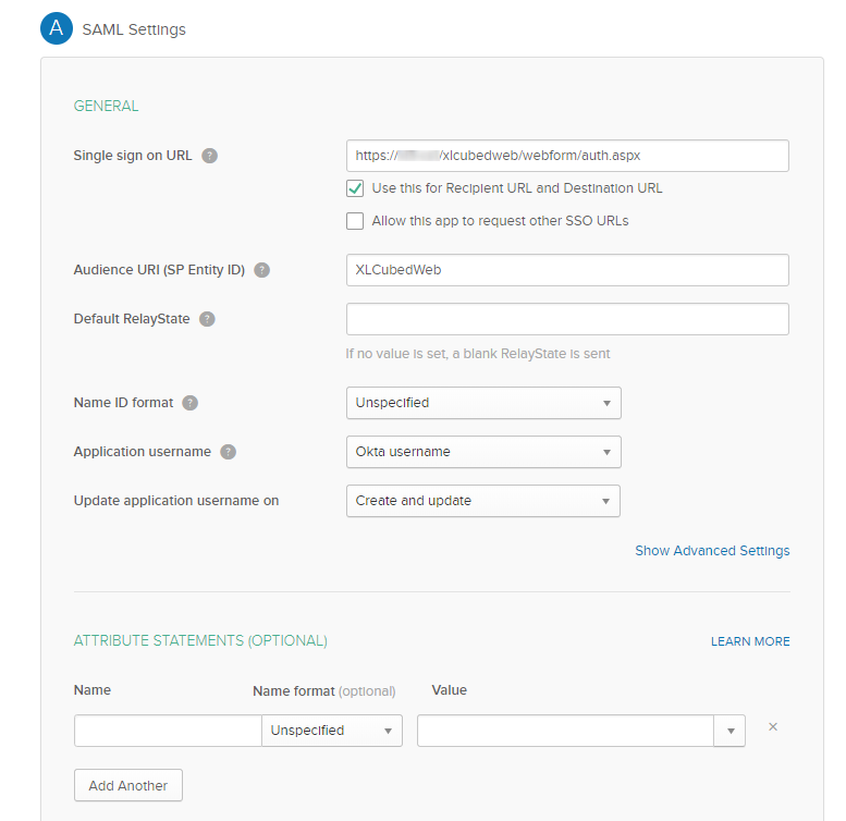 Configure the SAML settings, the URL is in the form of: http://server/xlcubedweb/webform/auth.aspx and must match the form the users will be entering in the browser. Use “XLCubedWeb” for the entity ID.