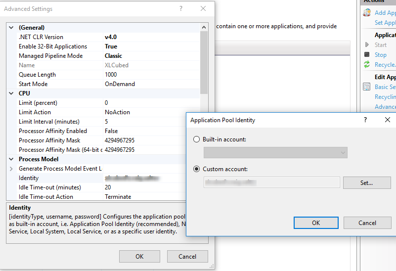 Now we need to configure XLCubedWeb, the first step is to set the application pool or the anonymous user to run as a domain account that is either an Admin in Analysis Services or a Cube Admin.