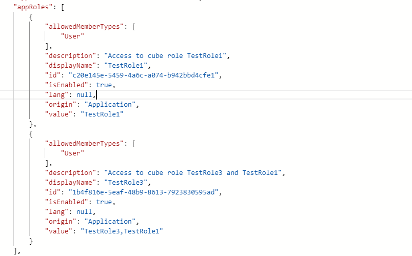 A user or group (if using Azure enterprise features) can only have one application role. For every combination of cube roles you must create an entry in appRoles. The “value” can be a comma-delimited list of all the cube roles to use: