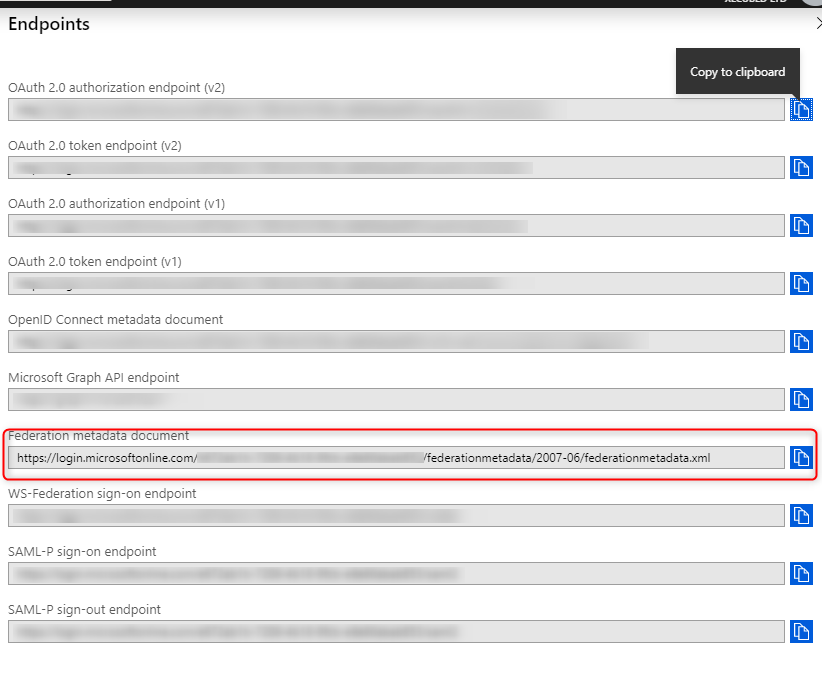 You next need to get the metadata xml file to import into XLCubed. This is a general file that is specific for your Azure Domain and not application specific. To get the file click on “Endpoints” and open the URL given under “Federation metadata document”: