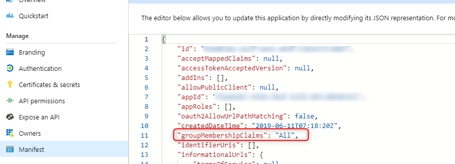 At this point anyone accessing XLCubedWeb will be taken to the appropriate Azure authentication page, but we have not yet provided a link between their group membership and the roles within XLCubed. To do this you first need to allow group membership to be passed via the App Registration. The first step is to go to “Manifest” and set “groupMembershipClaims” to “All”: