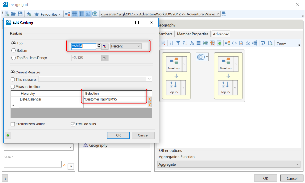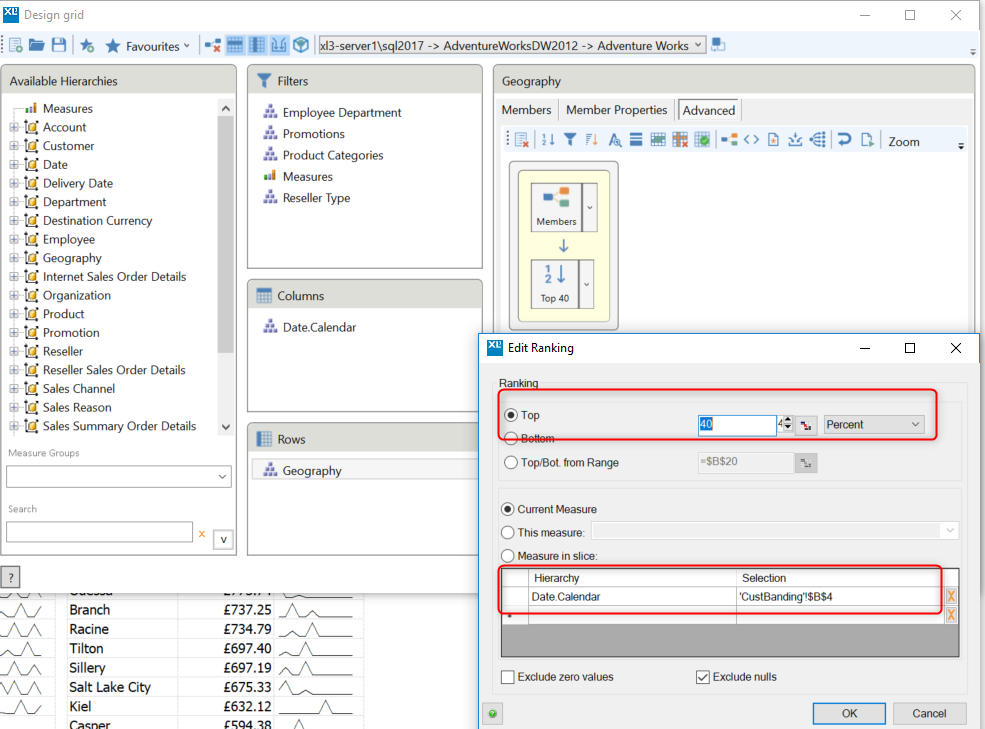 Note that the two items bordered below are Excel ranges – these are the outputs from % to rank slicer and (in this case) the output from the ‘comparison’ date slicer. There is similar ranking set up for the other date slicer.