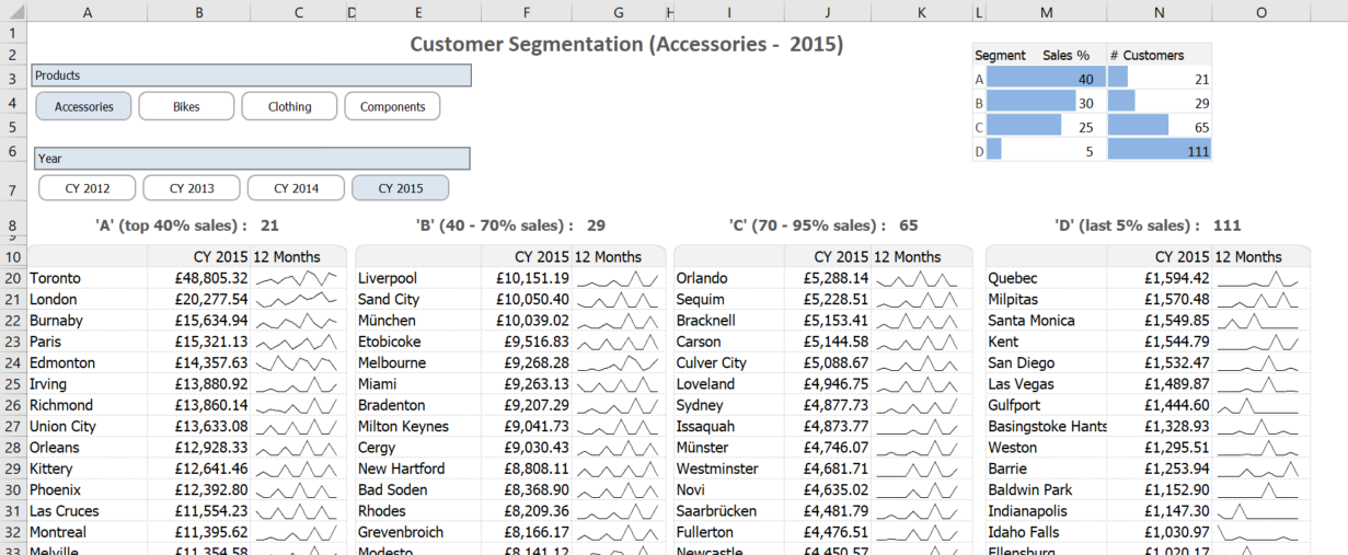 Lastly, the summary table at the top right uses standard Excel data bars to visualise the number of customers in each segment.