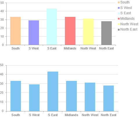 The top chart has a legend which is merely duplicating the categories already shown on the x-axis, and the colours are meaningless. The chart below simplifies the layout to provide a clearer view of the data.