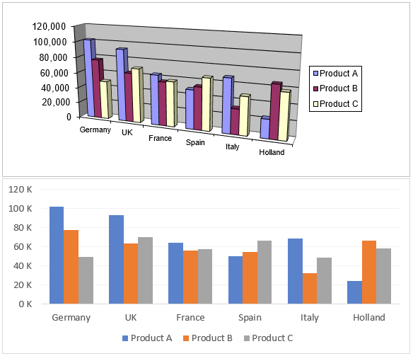 To take a familiar and simple example from Excel, the first chart below is from an old version of office using the default settings with 3D turned on, and the second chart is a mildy formatted version from the current version. Different software will give differing levels of chart clutter by default, but the example below starting from a deliberately bad base helps show some of the elements.