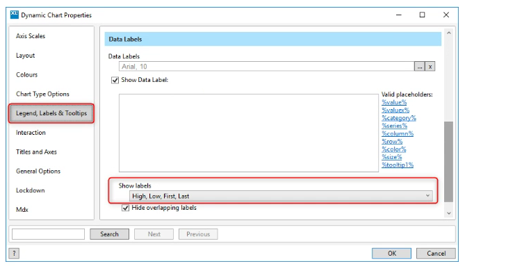 In this example, across the 16 charts there is a lot of data label text, and it makes the comparison of the different charts more difficult. In this case it’s actually better to remove some of the labels to create a clearer overall view. XLCubed has several options for this, but one which often works well is ‘High, Low, First, Last” as shown below.