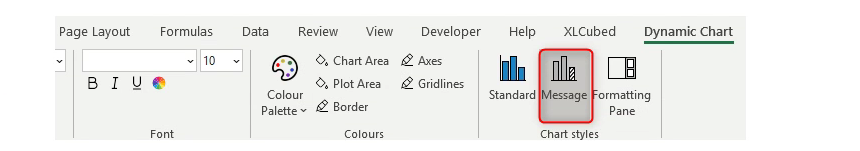 XLCubed’s Dynamic Charts apply sensible and clutter-free defaults to help set you on the right path to effective reporting with minimal effort. We have also added a ‘Message’ styling option to quickly align the charts to the IBCS standards.