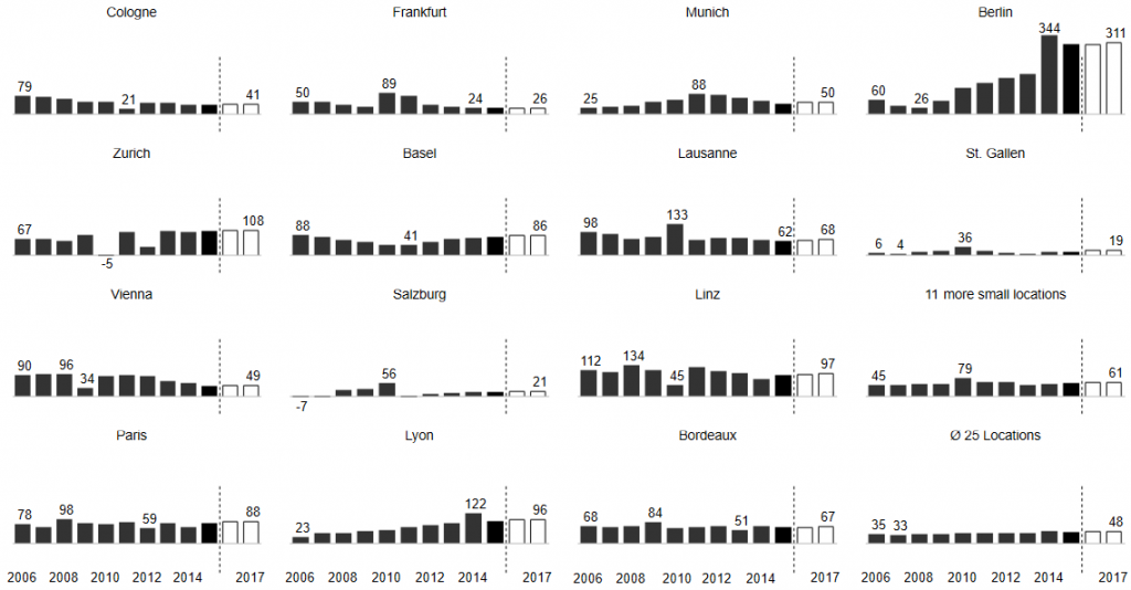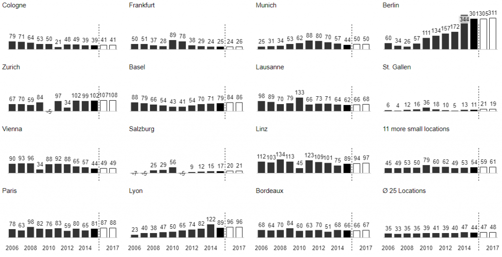Another consideration around chart clutter is ‘over-labelling’. Depending on the chart type, labelling every data point may cause the overall view of the chart to become obscured in a sea of numbers or captions. This can often be the case with small multiple, or trellis charts as shown below.