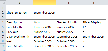 Previous and Next are again achieved using MemberNavigate, this time the syntax will be: XL3MemberNavigate(1,”[Time]”,SlicerData!$B$7,”Previous”).
