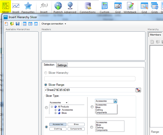 The slicer isn’t currently connecting to anything, or changing filters within a report. To do that, as it’s not directly connected to a hierarchy in the same way as a standard slicer, we need to go via the excel cell which it updates. So any XLCubed grids or formulae need to reference the cell which the slicer outputs its selection to, in this case in this case SlicerData!$B$2.