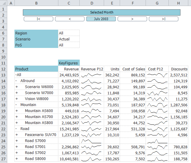 In our example we’ve just connected one grid, but there can be as many as required. Our example also gives some sales and costing detail for the main product categories. We also use in-grid sparklines to give a feel for the trend, and these can be drilled or sliced and diced in the same way as a standard grid.