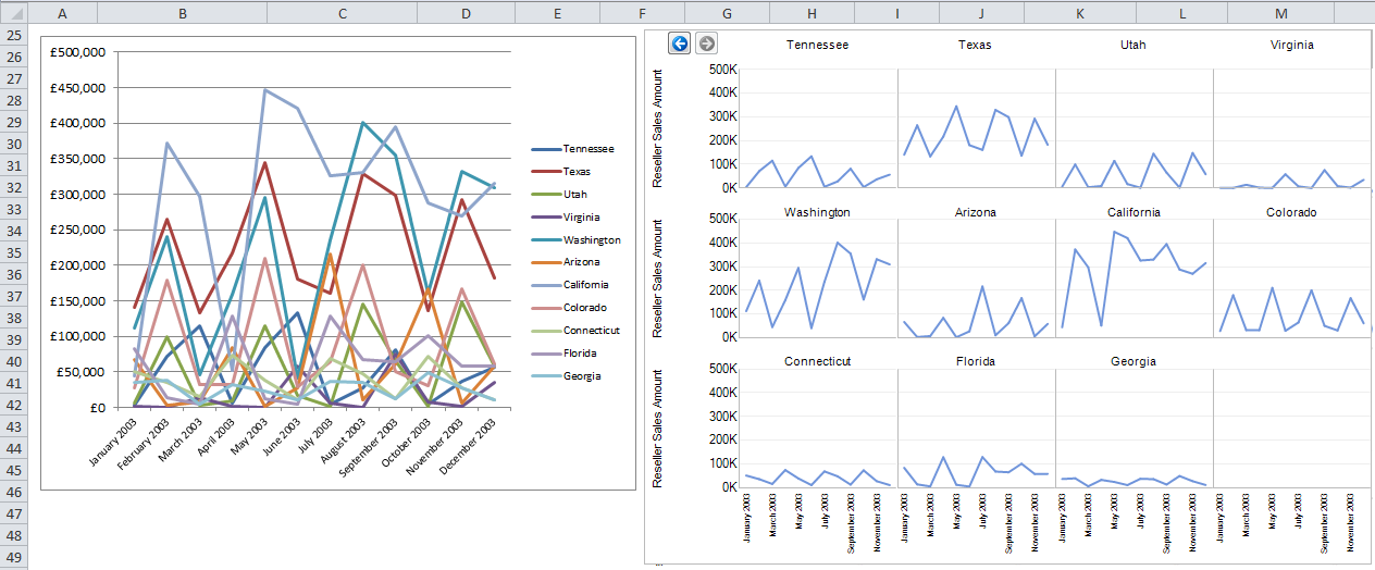 The most common use case for small multiples is separate line charts to compare trend across a large number of varying elements. Placing them all within one chart would cause either a ‘spaghetti chart’ , or lots of occlusion as shown in the comparison below. Here we use a standard Excel line chart, and an XLCubed small multiple to chart the same data. Separating the charts while keeping a consistent axis scale makes for a much easier comparison than in the single chart.